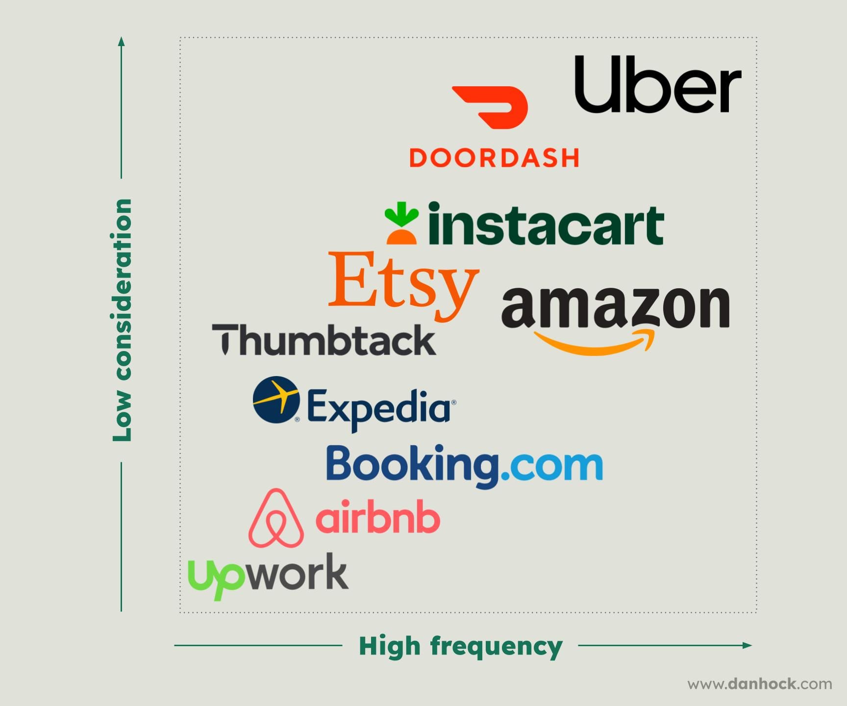 The marketplaces least likely to lose transactions are high frequency, low consideration use cases like ride sharing. And the most exposed are low frequency, high consideration like travel.