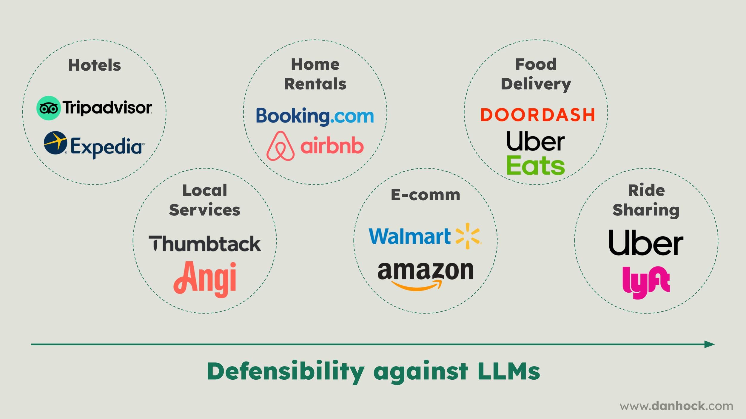 This includes underwriting the transaction with returns, guarantees, and financial terms, and it includes participating in physical service delivery, like building your own fleet or logistics network. All of these reduce gross margins, add operational complexity, and take a long time to get right. But that is precisely why LLMs won’t follow.