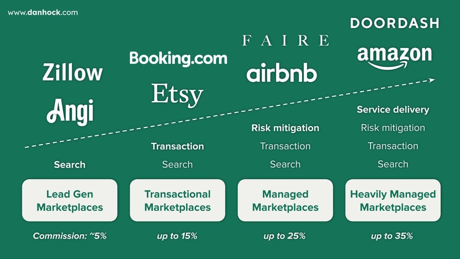 The number of these jobs a marketplace does determines how heavily managed it is (more on this here). The further to the right, the more defensible it will be.