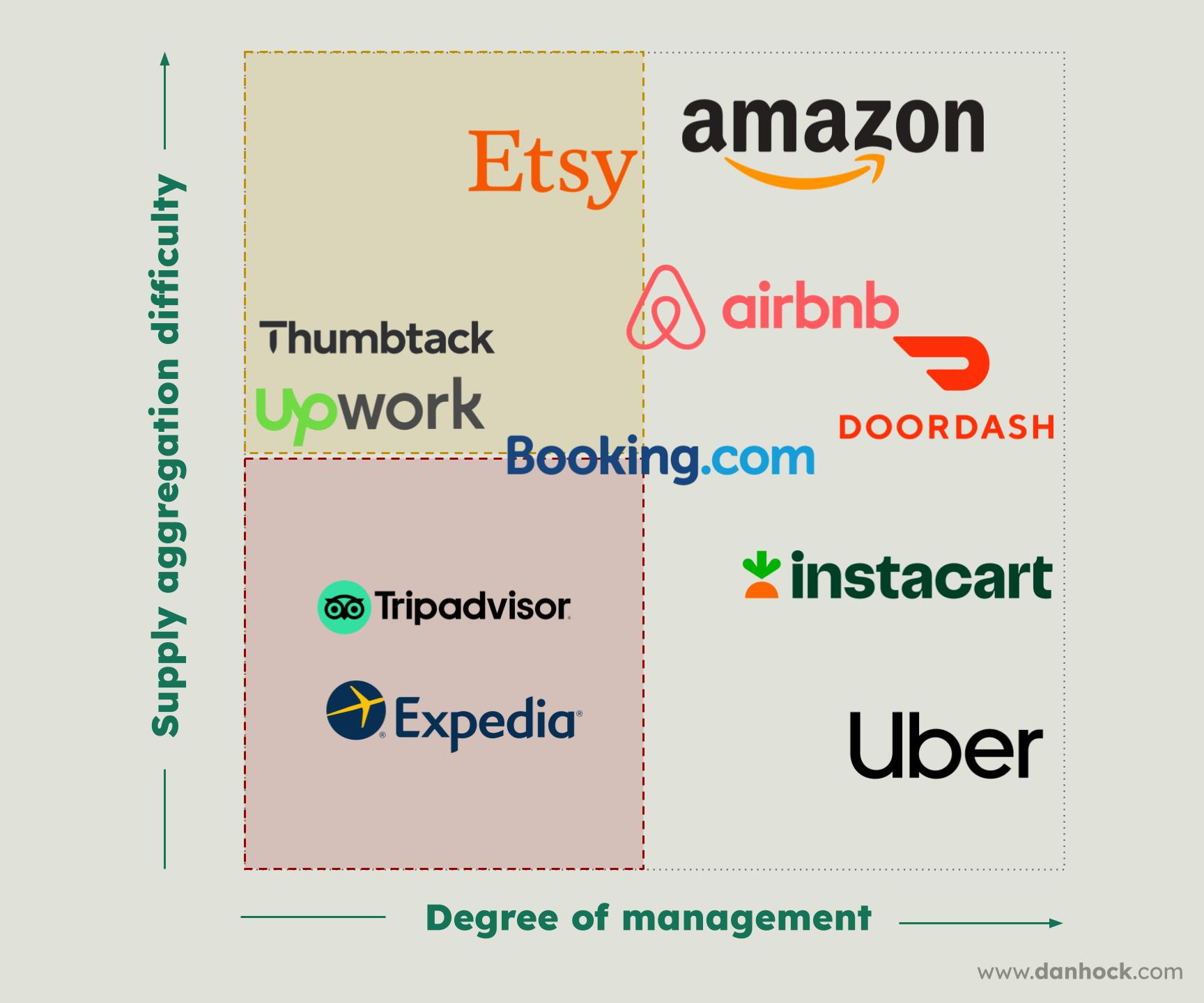 The most dangerous quadrant below is the bottom left. Marketplaces that (1) are not managed and (2) have supply that is easy to aggregate could be replaced entirely by an LLM.
