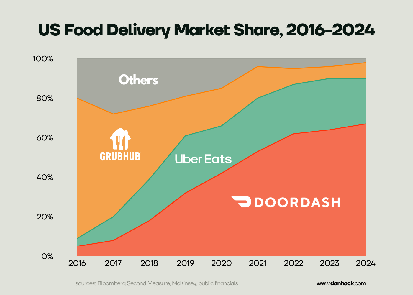 To win in a market, you can’t just be the market leader. You have to be the market leader by a lot. This creates a flywheel in which you have much more demand, which allows you to bring on more supply, which in turn compounds your demand advantage. Every market in food delivery was ultimately hard fought, but DoorDash’s initial wedge in the suburbs gave them an advantage no one else had.
