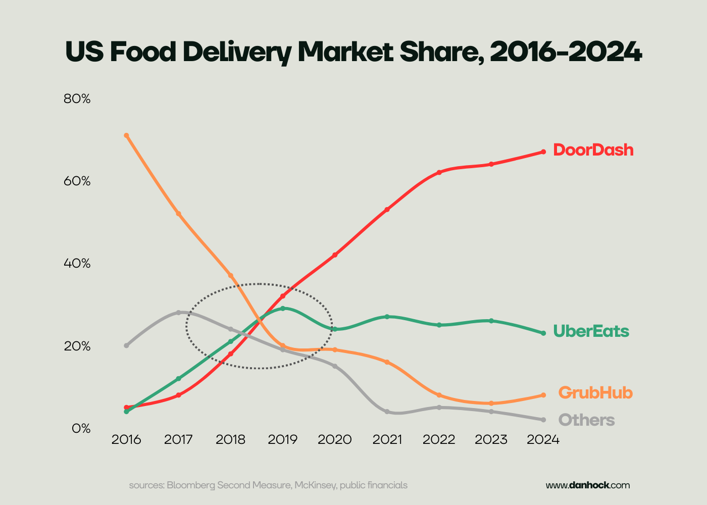 Uber and Grubhub had much deeper pockets during this time. DoorDash only survived through incredible speed of execution.